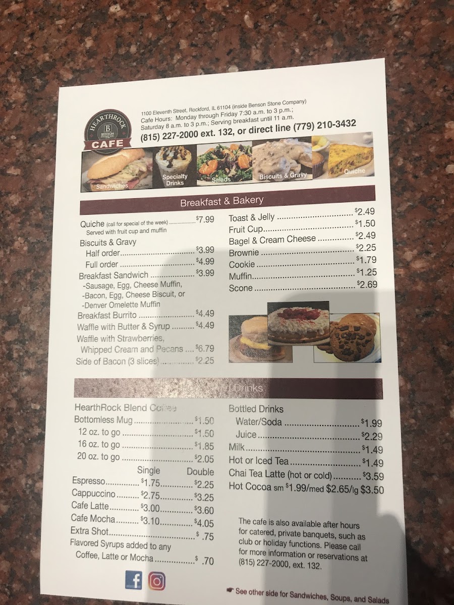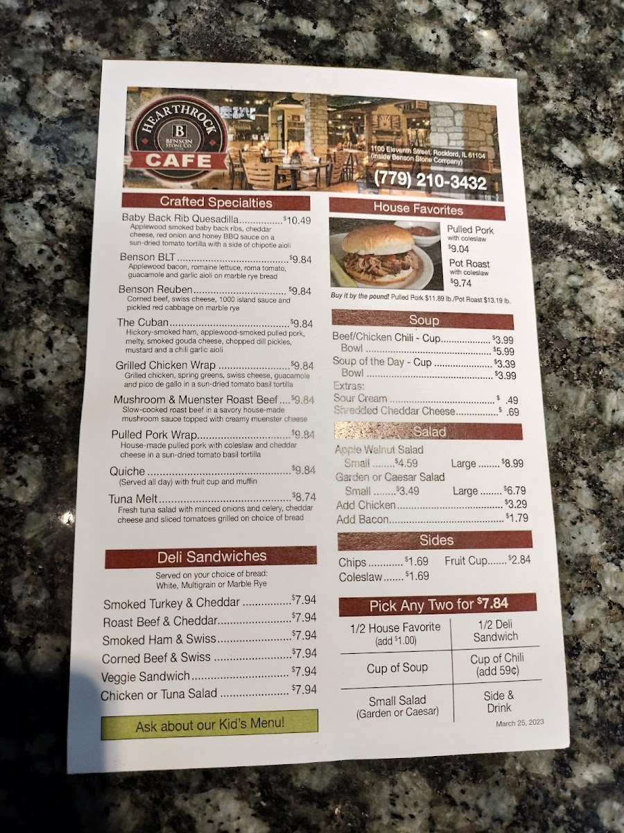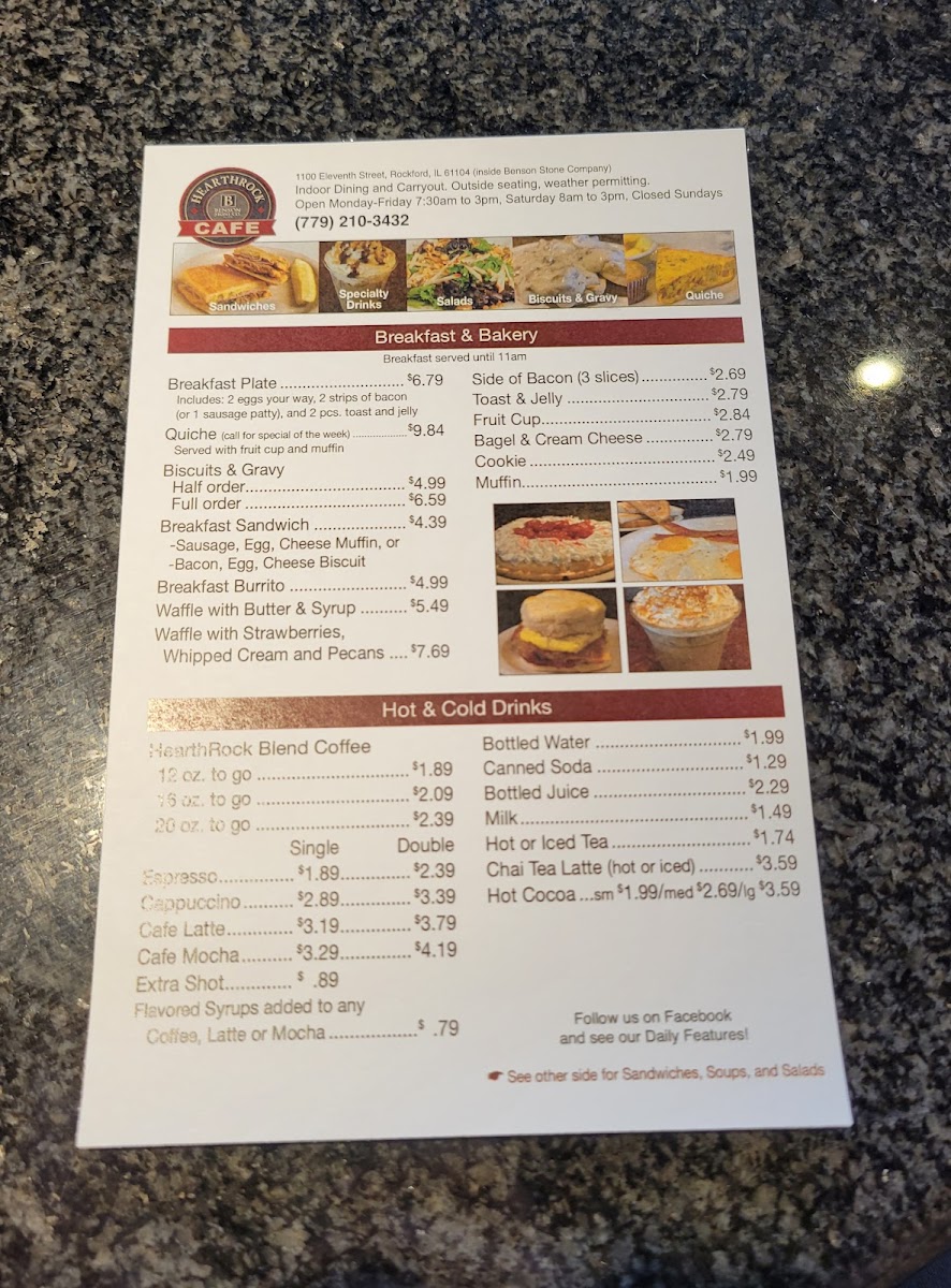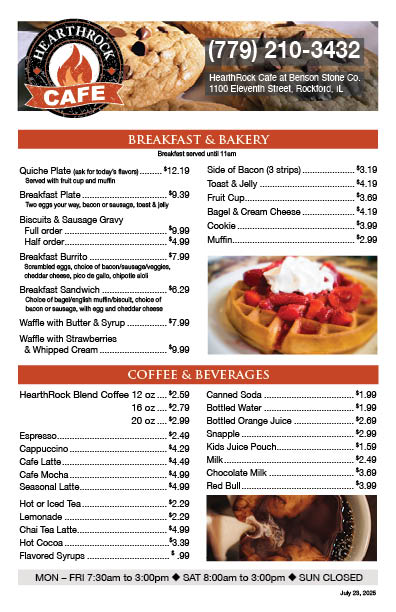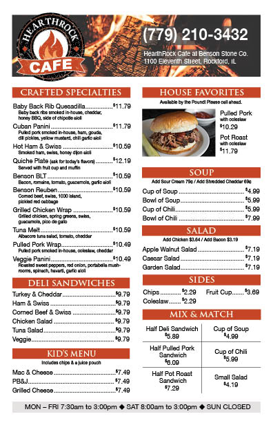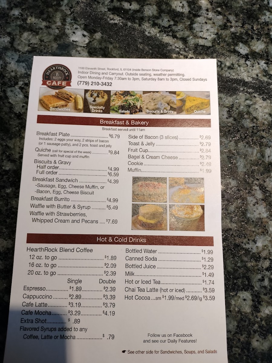 Welcome to HearthRock Cafe, a delightful haven located at 1100 11th St, Rockford, IL. This cozy cafe invites you to indulge in a menu that expertly blends comfort and flavor. Highlights include the mouthwatering Baby Back Rib Quesadilla and the zesty Cuban Panini, both crafted with in-house smoked meats that deliver a smoky richness. Breakfast offerings, such as the hearty Breakfast Burrito and homemade Quiche Plate, create a delightful morning experience.